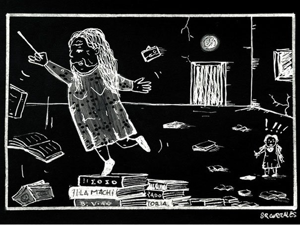 Abuela y nieta se pararon frente a la biblioteca. No hacía falta ser carpintera para saber que los estantes estaban enclenques e inestables. Ya con prisa, la abuela soltó a su nieta y empezó a tirar libros al piso, uno encima del otro. Hizo una pila de unos diez. La niña la miraba entretenida y admirada por la rapidez y precisión con que su abuela construía la segunda pila, ahora de veinte y luego otra más alta.