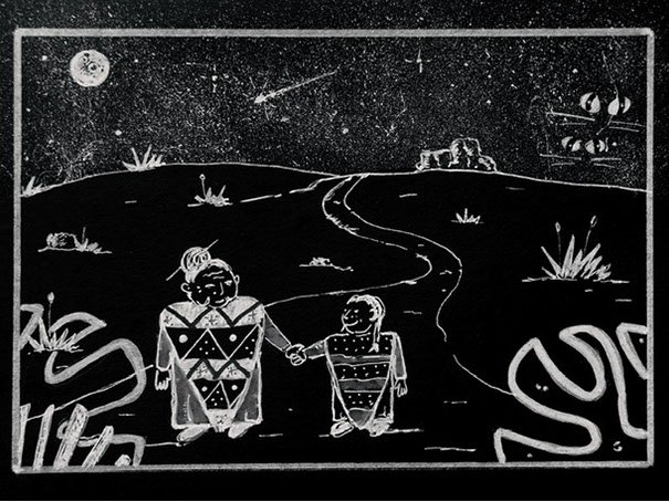 Al llegar, la abuela respiró hondo y comenzó a hacer unos extraños sonidos desde lo profundo de sus fauces. La nieta empezó a sentirse rara: la curiosidad se agotaba, el frío de la noche se anunciaba en la brisa y su abuela estaba más simpática que nunca, excepto por el hecho de que había empezado a ser esos raros lloriqueos. Enseguida se escucharon las respuestas. A la distancia se adivinaron dos siluetas felinas y la niña sólo atinó a agarrar el ruedo del poncho de su abuela. La niña apretó fuerte cuando vio aparecer a un joven puma, ya apenas se podía ver a través de la oscuridad de la primera noche.